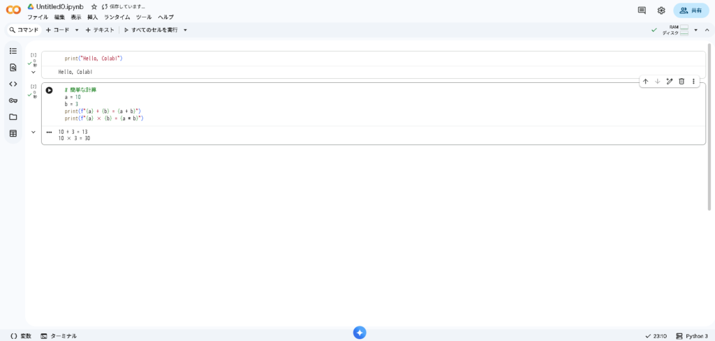 print("Hello, Colab!")セルの下に Hello, Colab! と表示されれば成功です。
