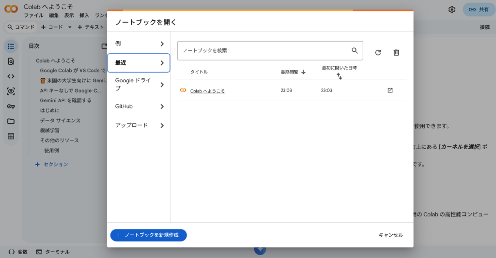 まずは Google Colab にアクセスして、新しいノートブックを作成します。Googleアカウントでログインしていれば、すぐに使えます。