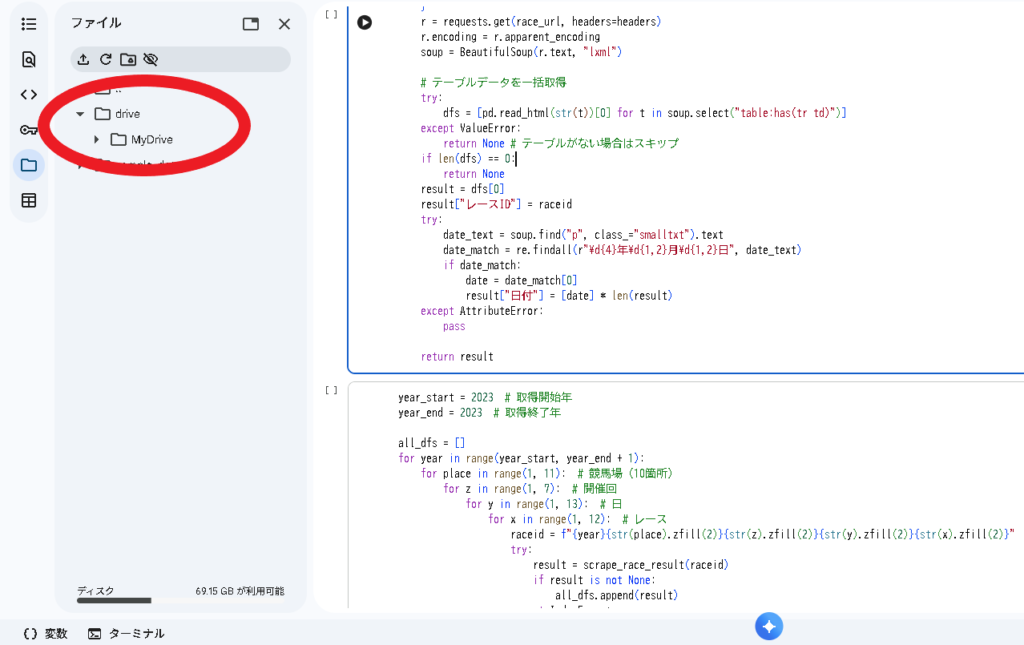 マウント後は、左側のファイルブラウザに drive フォルダが表示されます。ここからGoogle Drive内のファイルを確認できます。