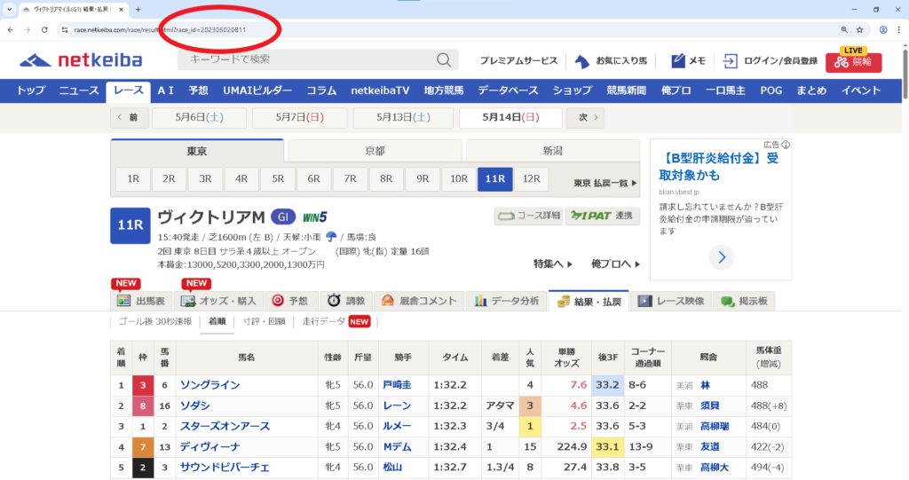 つまり、202305020811 というIDは「2023年・東京競馬場・第2回開催・8日目・第11レース」を表しています。